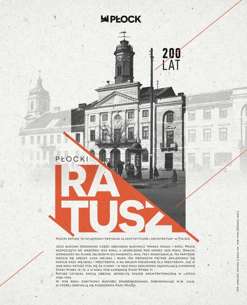 Ratusz w Płocku, lokalna perła klasycyzmu, wzniesiony został w latach 1824-1827. Budowa rozpoczęła się za miłościwie nam panującego Króla Polski Aleksandra II, a zakończona została podczas panowania Króla Mikołaja I. Losy Królestwa Polskiego są nierozerwalnie związane z tym obiektem, bo to właśnie w nim w 1831 roku miało miejsce ostatnie posiedzenie Rządu Narodowego i powstańczego Sejmu Królestwa Polskiego.